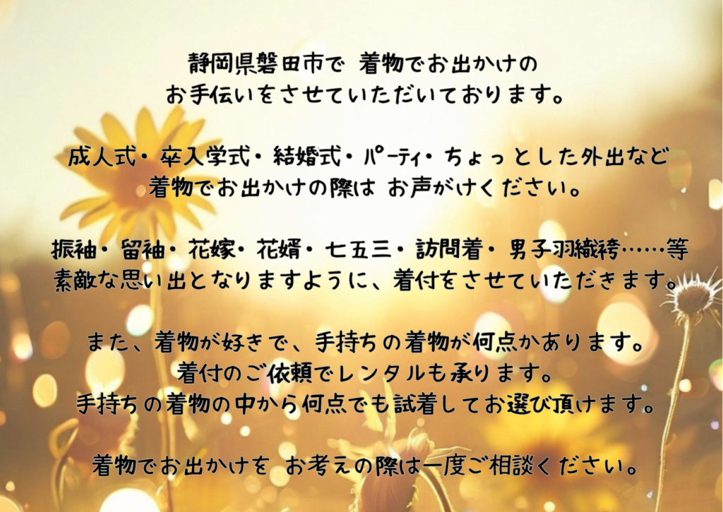 私達の着物を選んで頂き着付けをさせて頂き、貴方様と御縁が出来ましたら幸いです。